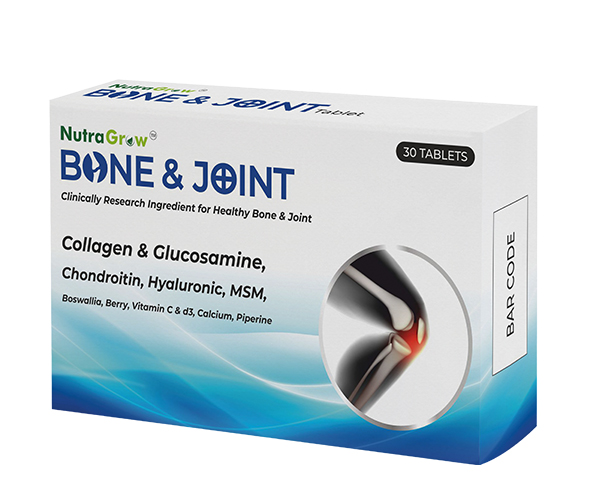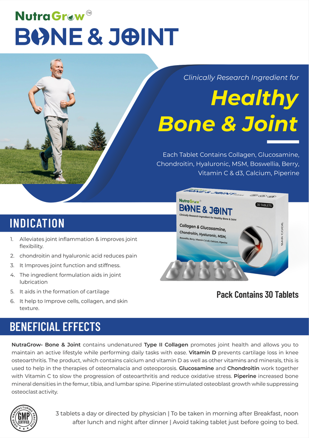 NutraGrow- Bone & Joint contains undenatured Type II Collagen promotes joint health and allows you to maintain an active lifestyle while performing daily tasks with ease. Vitamin D prevents cartilage loss in knee osteoarthritis. The product, which contains calcium and vitamin D as well as other vitamins and minerals, is used to help in the therapies for osteomalacia and osteoporosis. Glucosamine and Chondroitin work together with Vitamin C to slow the progression of osteoarthritis and reduce oxidative stress. Piperine increased bone mineral densities in the femur, tibia, and lumbar spine. Piperine stimulated osteoblast growth while suppressing osteoclast activity.