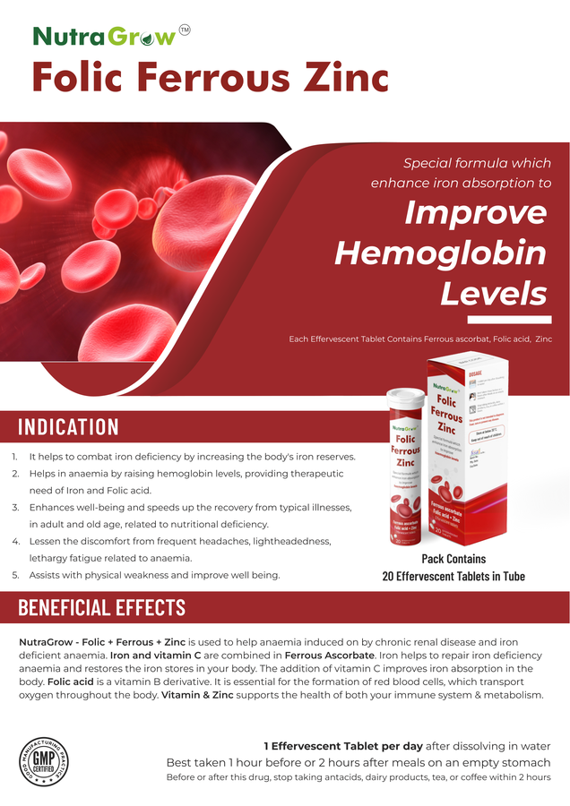 NutraGrow – Folic + Ferrous + Zinc is used to help anaemia induced on by chronic renal disease and iron deficient anaemia. Iron and vitamin C are combined in Ferrous Ascorbate. Iron helps to repair iron deficiency anaemia and restores the iron stores in your body. The addition of vitamin C improves iron absorption in the body. Folic acid is a vitamin B derivative. It is essential for the formation of red blood cells, which transport oxygen throughout the body. Vitamin & Zinc supports the health of both your immune system & metabolism.