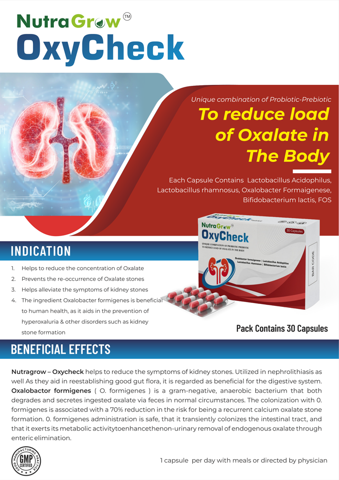 Nutragrow – Oxycheck helps to reduce the symptoms of kidney stones. Utilized in nephrolithiasis as well As an aid in reestablishing good gut flora, it is regarded as beneficial for the digestive system. Oxalobactorformigenes( O.formigenes ) is a gram-negative, anaerobic bacterium that both degrades and secretes ingested oxalate via feces in normal circumstances. The colonization with 0. formigenes is associated with a 70% reduction in the risk for recurrent calcium oxalate stone formation. 0. formigenes administration is safe, in that it transiently colonizes the intestinal tract, and it exerts its metabolic activitytoenhancethenon-urinary removal of endogenous oxalate through enteric elimination.