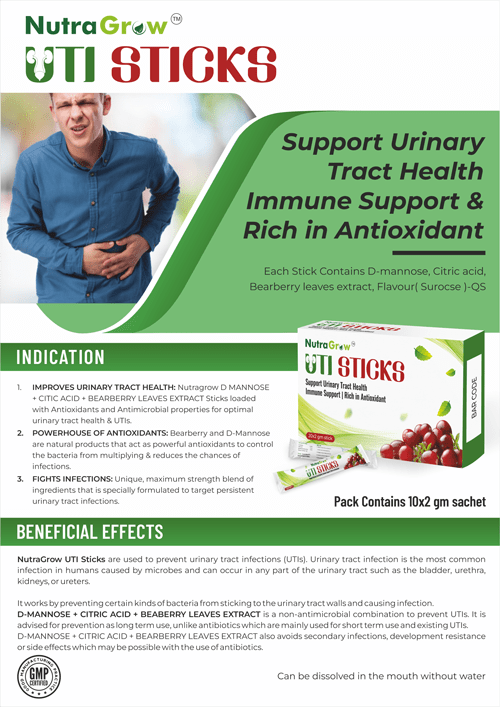 It works by preventing certain kinds of bacteria from sticking to the urinary tract walls and causing infection. D-MANNOSE + CITRIC ACID + BEABERRY LEAVES EXTRACT is a non-antimicrobial combination to prevent UTIs. It is advised for prevention as long term use, unlike antibiotics which are mainly used for short term use and existing UTIs. D-MANNOSE + CITRIC ACID + BEARBERRY LEAVES EXTRACT also avoids secondary infections, development resistance or side effects which may be possible with the use of antibiotics.